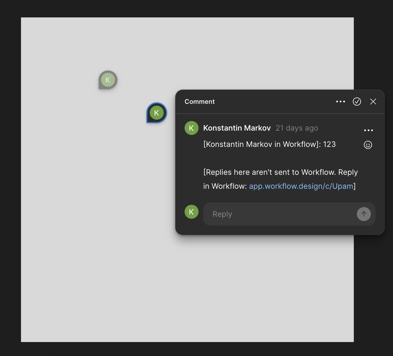 Reply comments stay in Workflow: When you reply to a comment on a Figma design in Workflow, that reply is only visible in Workflow, not synced to Figma.